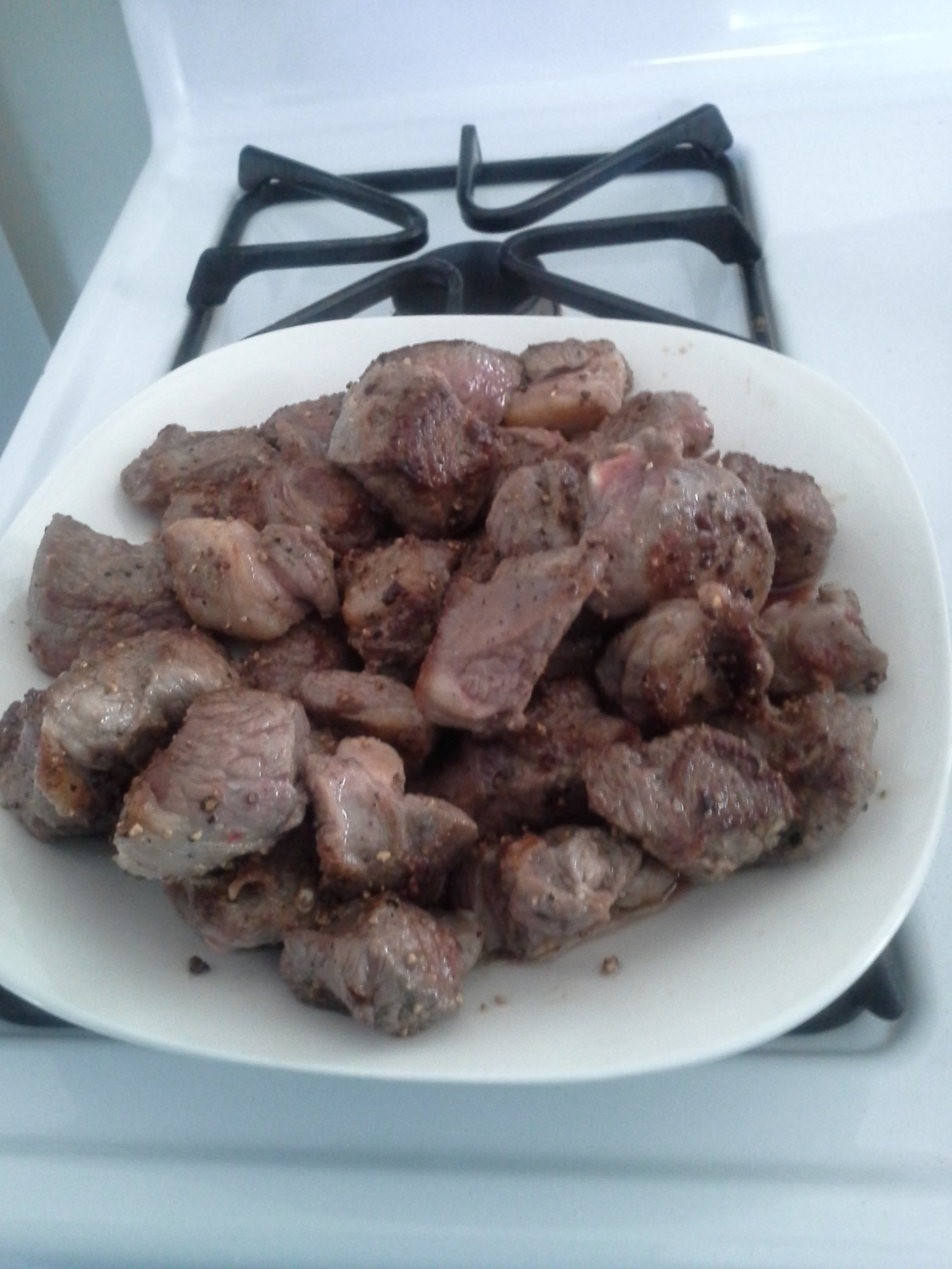 Heat 2 T of oil over medium-high heat in a heavy frying or braising pan, ideally avoid non-stick pans since it is hard to get a nice crust with those. “Sticky” pans are much better for this. Add lamb to the pan spaced out so the pieces don’t touch each other. You’ll . You may need to do this in 2-3 batches. Brown the meat – high heat, no stirring for a few minutes per side. Set the cooked meat aside and do the next batch. Add oil as necessary.